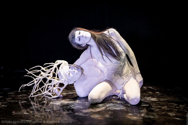 Ichihara and Vangeline each come from different Butoh backgrounds; Ichihara from Sankai Juku, or what could be considered “classical” Butoh, while Vangeline’s 20 years of Butoh expertise was informed by her prior experience as a jazz and burlesque dancer. The artists imagine this encounter as cultural cross-pollination: the creation of something new and original choreographically, challenging aesthetic expectations and carrying Butoh into the 21st century.