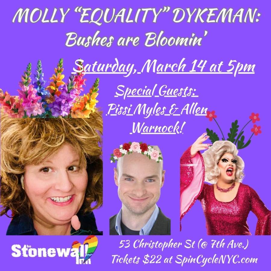 Molly “Equality” Dykeman — the lovable, unapologetic, barely lucid train wreck who spends her days working as a security guard at PS 339 in the Bronx and her nights seducing women across the five boroughs — is back with an all-new show! Bushes Are Bloomin’! celebrates the end of winter, International Women’s Month, St. Patrick’s Day, and the arrival of spring with brand-new, women-centered poetry, dancing, and comedy — plus bloomin’ bushes of all kinds.