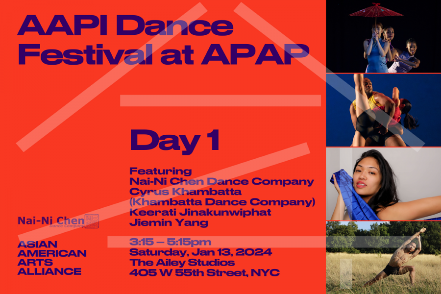 The Nai-Ni Chen Dance Company and Asian American Arts Alliance (A4) are pleased to present an evening of thrilling AAPI dance with performances from the Nai-Ni Chen Dance Company, Shannon Yu 余香儒 (2023 Jadin Wong Fellow), and Ishita Mili (2023 Jadin Wong Artist of Exceptional Merit). Performances are Saturday, January 13 at 3:15 pm and Sunday, January 14 at 1:15pm at The Ailey Studios, 405 W 55th St., New York, NY. Tickets are $25 and are available at https://www.aaartsalliance.org/events/aapi-dance-festival-at-apap-day-1 for the first day of performances and https://www.aaartsalliance.org/events/aapi-dance-festival-at-apap-day-2 for the second.