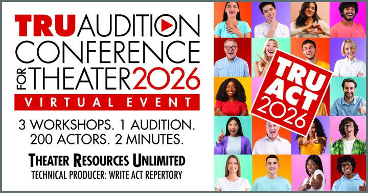 Theater Resources Unlimited (TRU) continues its month of programming for actors, known as the TRU Audition Conference for Theater 2026 (ACT26), a series of actor workshops and conversations about acting, leading to a weekend of auditions. Attend the workshops, starting with Tech Smart: Digital Audition Toolbox, and master the nuances of the virtual audition. Then be seen by up to 40 theater companies, producers, writers, directors, agents, and casting directors in one 2-minute audition. Registration for ACT26 also includes the April 10 Community Gathering, the first of two conversations geared for Actors. Visit truonline.org/events/virtual-audition-conference-2026/ for more information and to register, or email TRUActors@gmail.com with questions. You must register to receive a link to this month of events. Registrations close April 22, 2026.