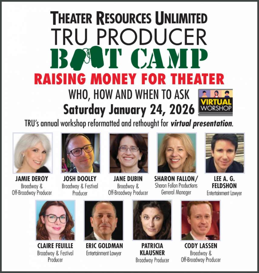 Theater Resources Unlimited (TRU) announces Raising Money for Theatre 2026: Who, How and When to Ask, an annual workshop expanded to include people Zooming in from out of town, set for Saturday, January 24, 2026. Register here for more information. The price is $200 for non-members, $165 for TRU members.