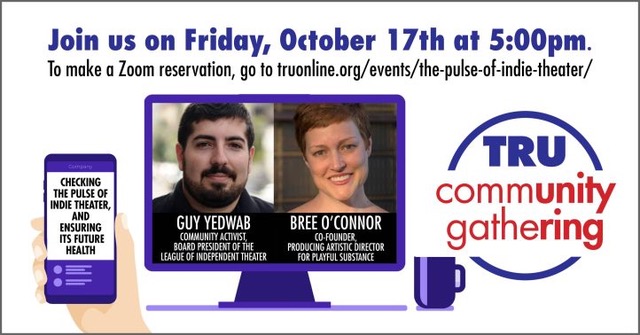 Register here to receive a Zoom link. These gatherings are a service for the theater community and are offered free for TRU members; non-members may also attend for free, but we ask that non-members help keep us running by buying a ticket, making a donation or joining as a member.