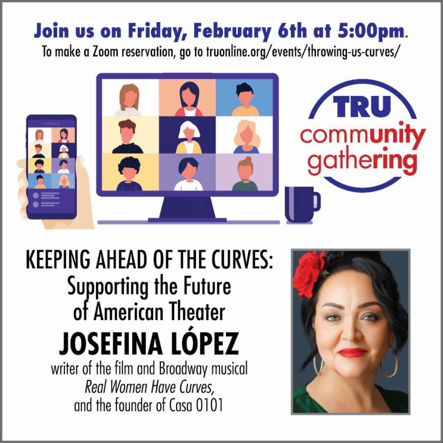 2/6 – Keeping Ahead of the Curves: Supporting the Future of American Theater. In the room: Josefina López​, writer of the film and Broadway musical Real Women Have Curves, and the founder of Casa 0101, dedicated to “nurturing the future storytellers of Los Angeles.” We’ll talk about Josefina’s experiences – both in film and on Broadway – with the adaptations of her play, and whether the productions adequately addressed the need for authentic voices in the room as well as authenticity on the stage. Were there compromises, and were there outside eyes that brought positive enhancements to her original work? How comfortable were the collaborations, and how does the creative process differ in collaboration versus the isolated experience of writing? Click https://truonline.org/events/throwing-us-curves/ to register and receive the link.