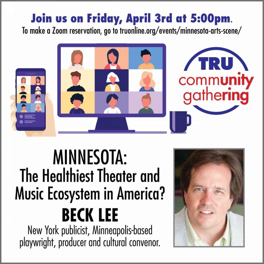 Visit https://truonline.org/events/minnesota-arts-scene/ to receive this Friday’s Zoom link. These gatherings are a service for the theater community and are offered free for TRU members; non-members may also attend for free, but we ask that non-members help keep us running by buying a ticket, making a donation or joining as a member.
